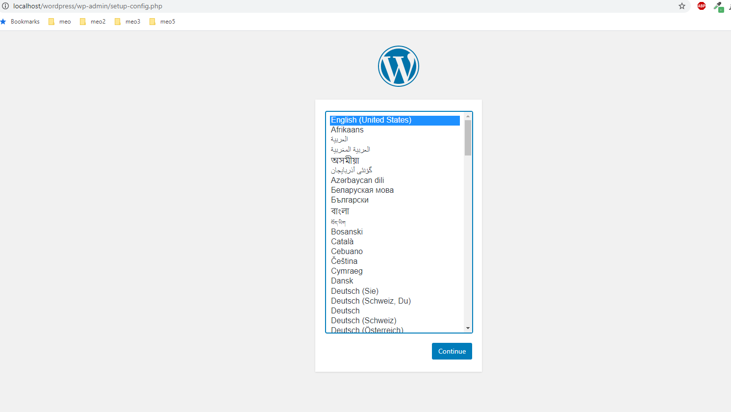 7 - After database creation completed, you can start accessing your wordpress project in browser to start the setup wizard. In this demo the url link is http://localhost/wordpress. If everything are correct, you will be greeted with language selection & click "Continue" to proceed.